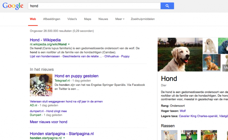 Als je in de witte balk hond intypt en daarna klikt op Google zoeken, krijg je het volgende te zien: