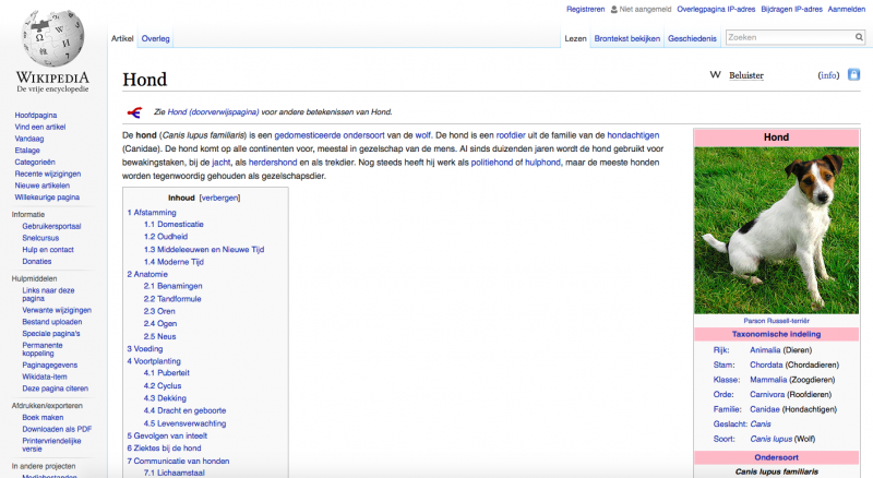 Zoals je kunt zien op het plaatje hierboven, staat bij de eerste link 'Wikipedia'. Hier kun je veel informatie lezen over hond. Als je op Wikipedia klikt krijg je het volgende te zien: